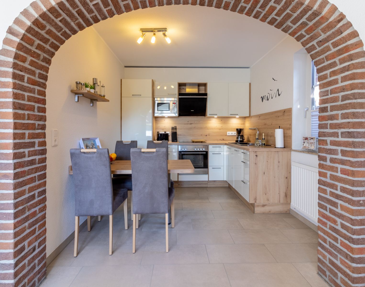 Durchgang zur offenen neuen, komplett ausggestatteten Küche