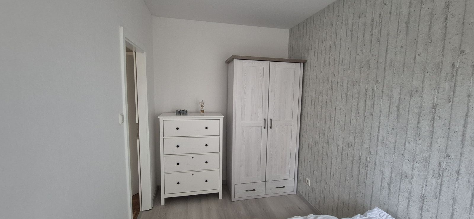 Schlafzimmer mit bequemen Bett, Nachttisch, Kleiderschrank und Kommode