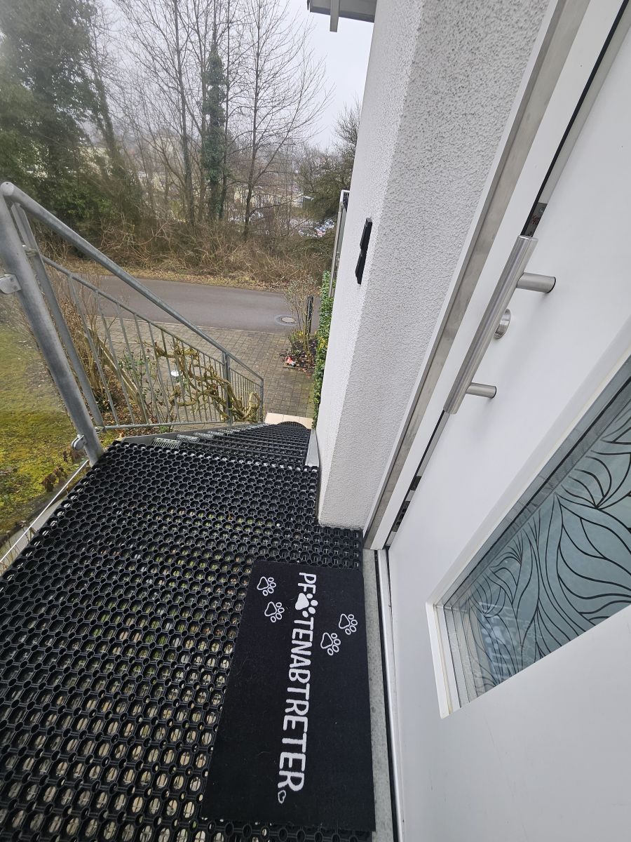 Parkplatz mit Treppe zur Wohnung Treppe ist offen, aber mit einem Pfotenschutz belegt